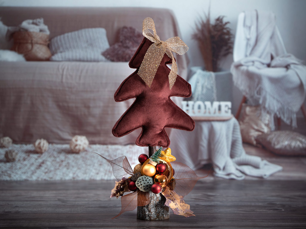 Aranjament brad de Crăciun este un aranjament micuț, simplu și finuț ce poate fi oferit cu succes ca și cadou celor dragi în apropierea Sărbătorilor de iarnă. Inălțimea aranjamentului este 37 cm. Brăduțul este realizat dintr-un material care imită catifeaua, foarte fin la atingere.