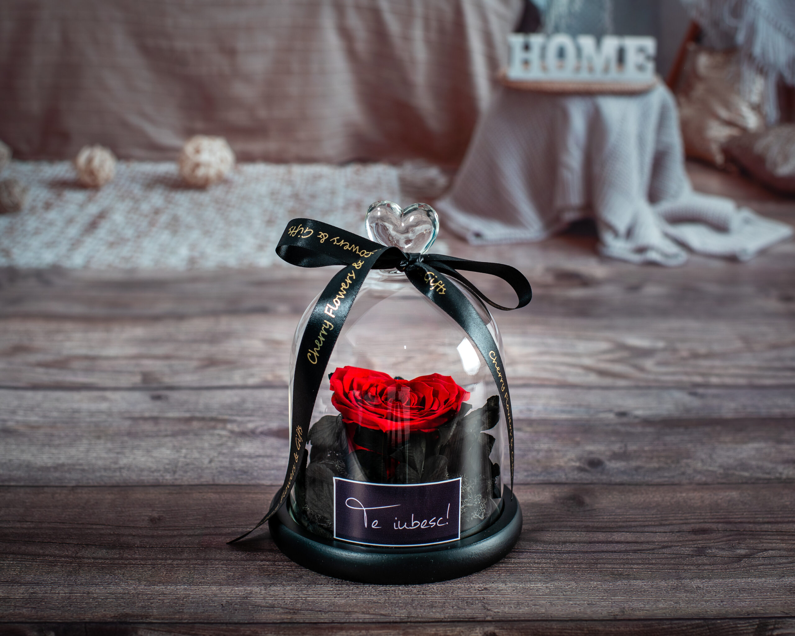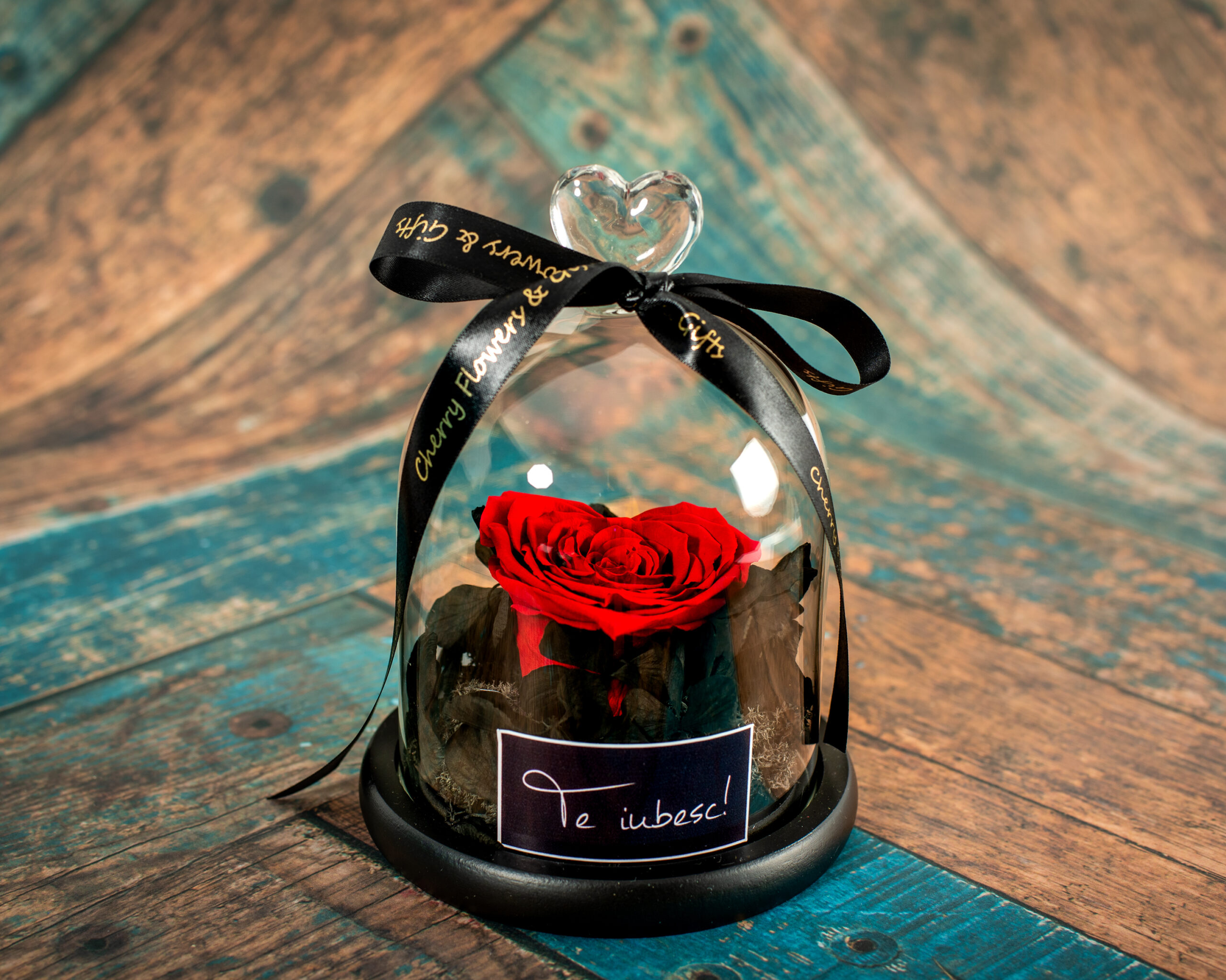 Cupola trandafir criogenat în formă de inimă poate fi un cadou inspirat pentru persoana iubită. Cupola este realizată manual din sticlă și acoperă un suport de lemn de culoare neagră, decorat cu licheni, calitate premium, hortensie criogenată neagră și trandafir de culoare roșu intens în formă de inimă. Diametrul blatului este de aproximativ 1o cm, iar înălțimea cupolei 15cm.