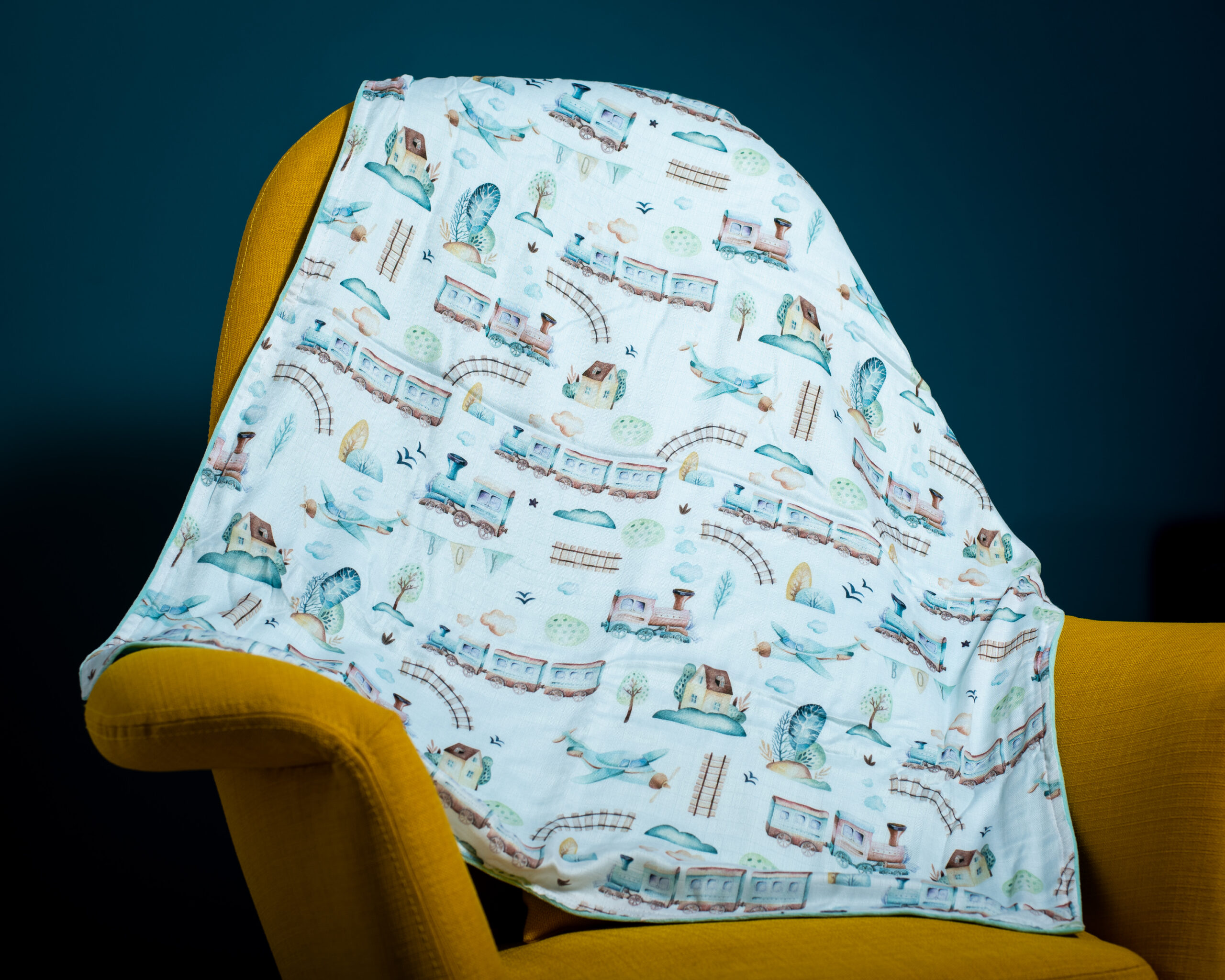 Păturică plușată de dimensiuni aproximative 100×110 cm. Este dispoibilă în două imprimeuri, trenulețe și ocean.