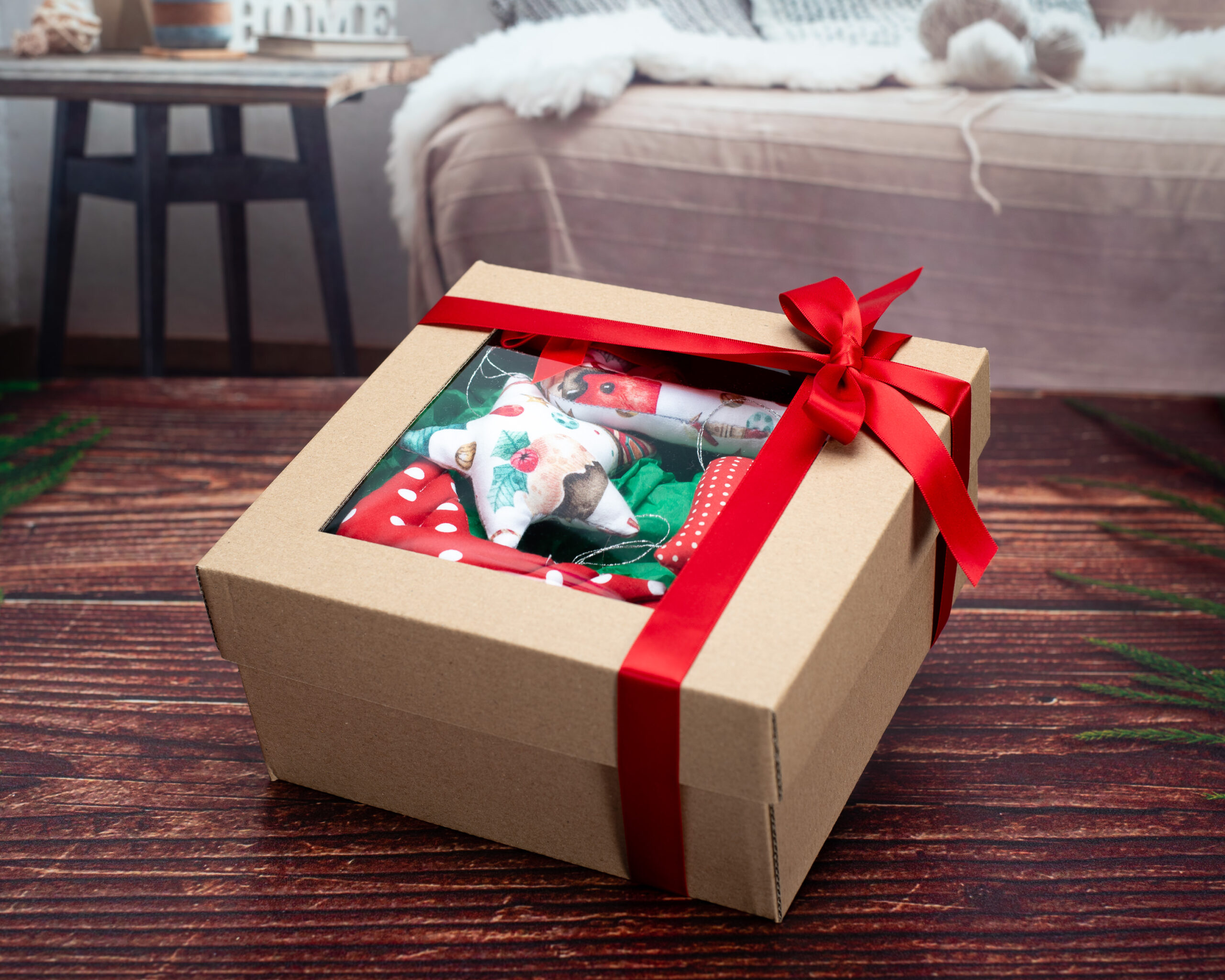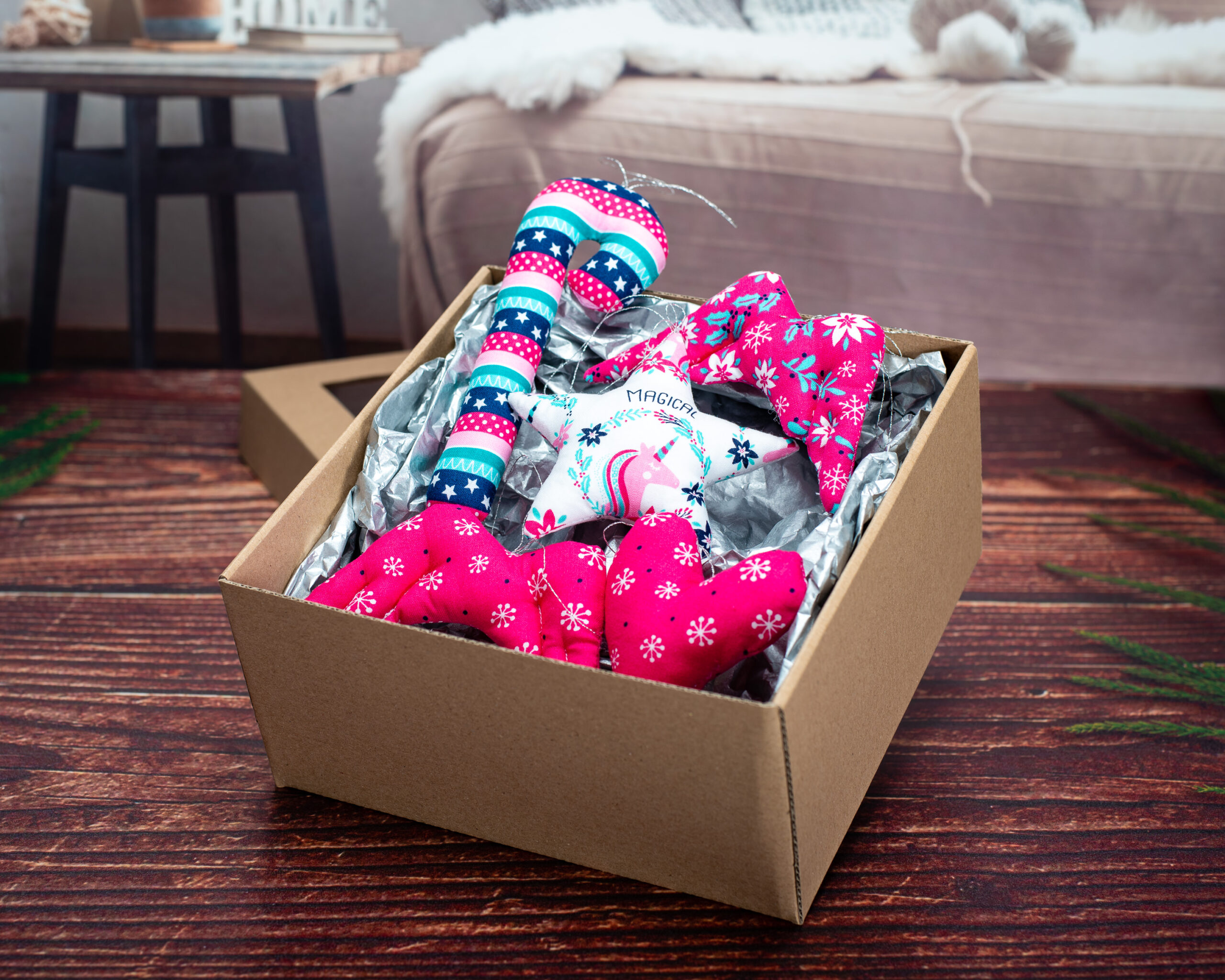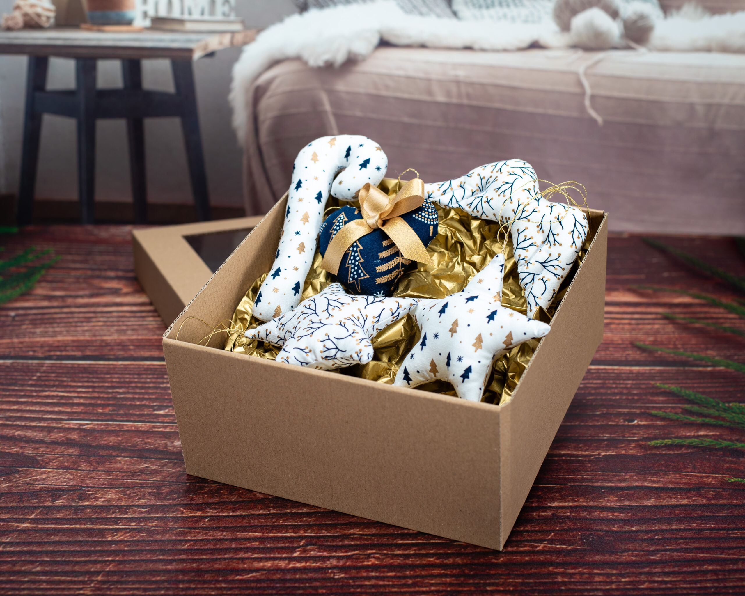 Decorațiunile sunt lucrate manual din bumbac certificat, fiind umplute cu puf siliconic antialergenic. Timpul mediu de realizare a unei astfel de cutiuțe este de aproximativ 8 ore lucrătoare. Modalitatea de ambalare este identică cu cea prezentată în fotografii.